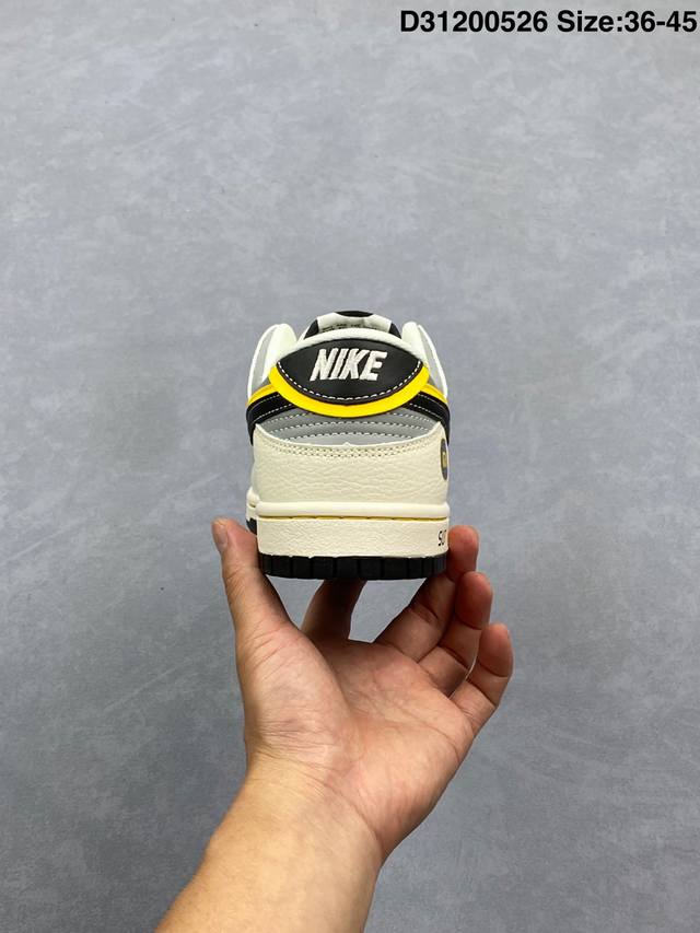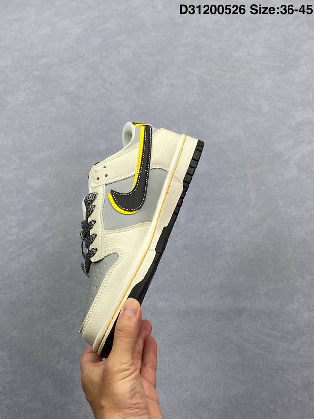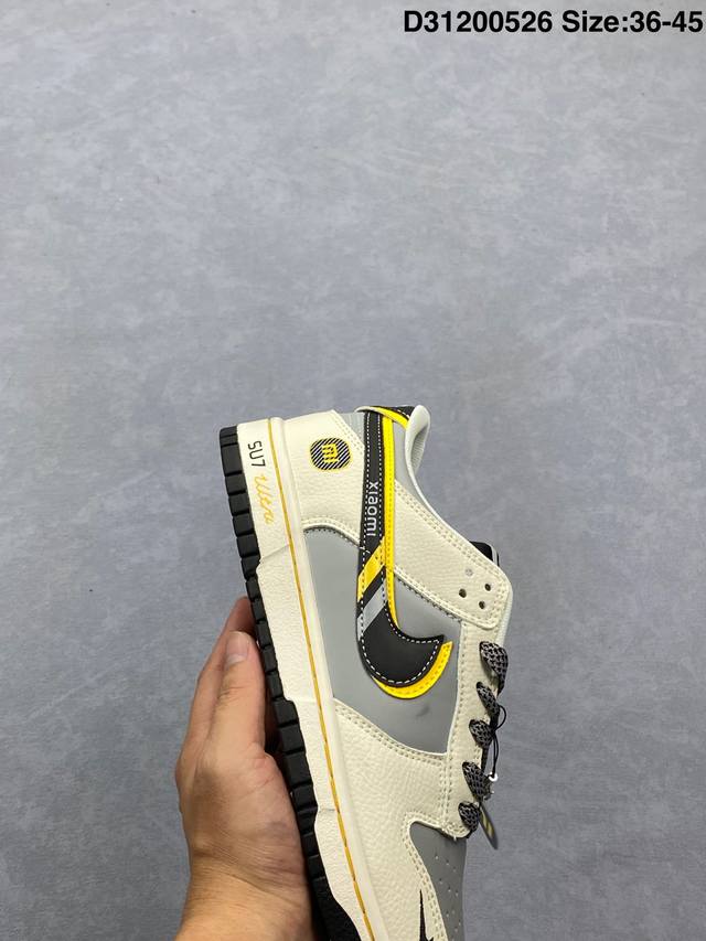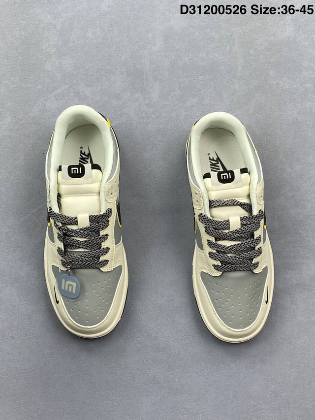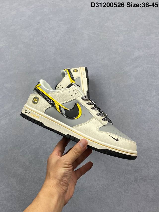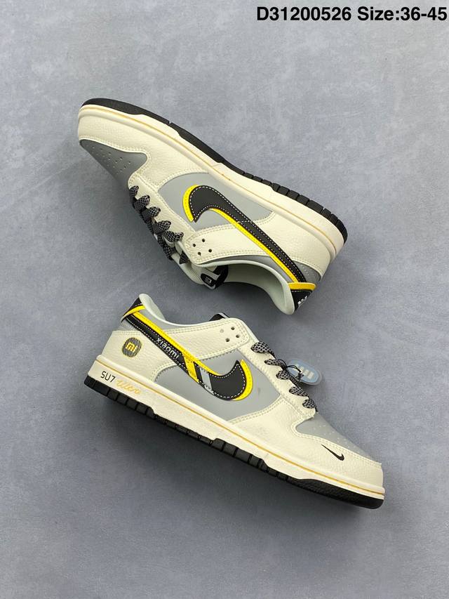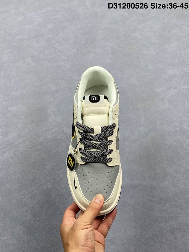 xiaomi X Nike Dunk Sb Low 小米 X 耐克 Sb 低帮 联名灰白黑 鞋身整体以灰色皮革打造 搭配米白色皮革框架覆盖层 使鞋款十分百搭 鞋舌绣标上以白色小米Logo呈现 鞋身两侧双Swoosh Logo分别采用黑色 黄色点缀 后跟饰片辅以黑黄皮革呈现 鞋舌是网眼布材料 增强了透气性 后跟Nike字样以白色刺绣妆点 鞋头处侧边迷你Nike Swoosfh Logo以黑色刺绣点缀 后跟印有小米品牌Llogo 彰显联名身份 最后以米白色中底搭配黑色橡胶外底完善整体设计收尾