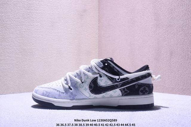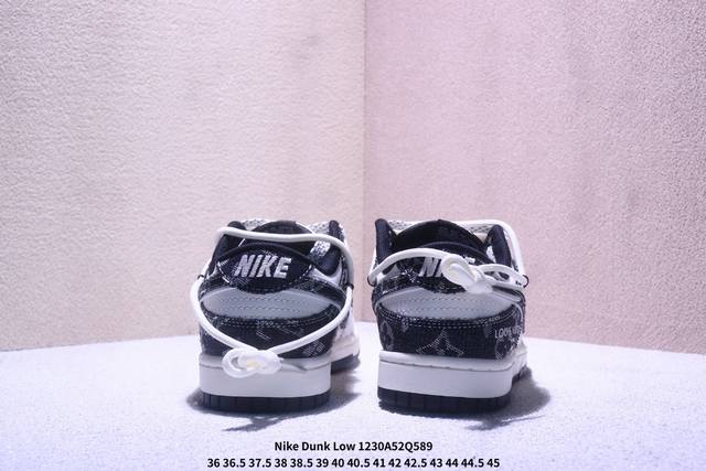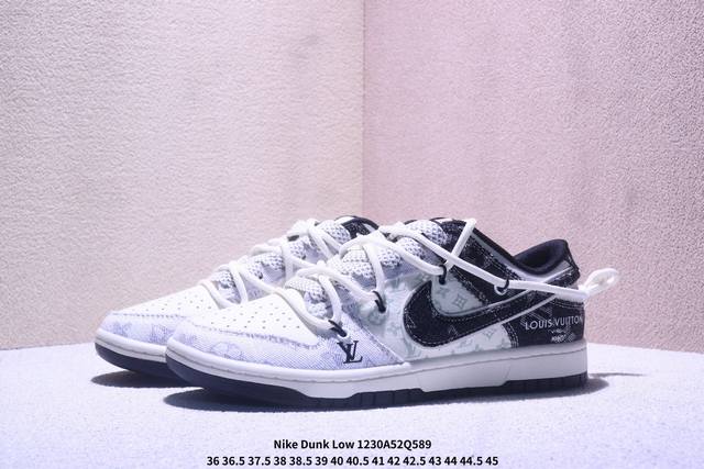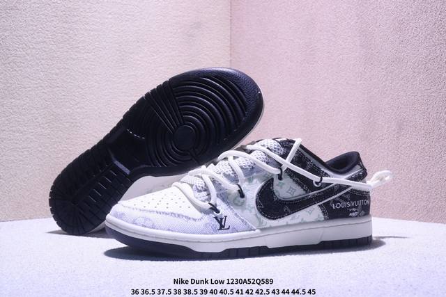 丹宁奢潮,低帮新韵|Nike Dunk Low X Louis Vuitton联名款!当Nike Dunk Low的复古街头灵魂邂逅Louis Vuitton的高奢丹宁美学,这双Cx5050-Y43联名款成为奢潮跨界的惊艳力作,将街头板鞋的随性与高定品牌的精致碰撞出全新火花。 Ddd 鞋身以黑白丹宁布料为核心材质,拼接印满Lv经典Monogram老花的浅纹面料,丹宁的粗粝质感与老花的奢雅纹路相互交织,瞬间营造出层次丰富的视觉张力。解构主义设计的黑色丹宁Swoosh打破常规,鞋侧的“Louis Vuitto