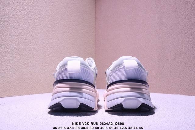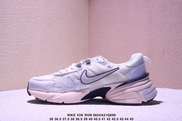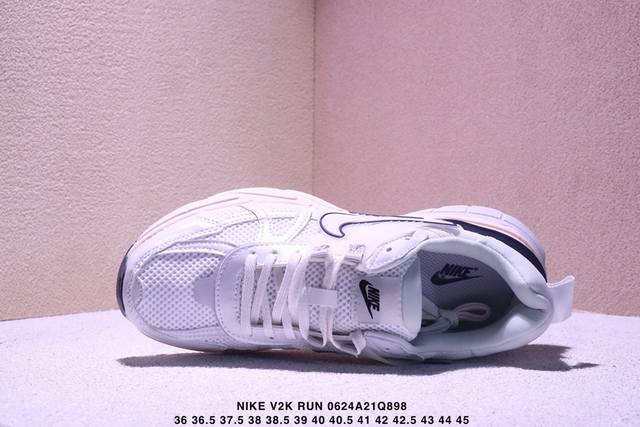 真标耐克Nike V2K Run跑步鞋复古风潮 网面透气运动鞋 灰银紧致的鞋面材质提供良好的包裹性鞋侧 Swoosh以及鞋头部分搭配增添不少亮点的镀铬细节鞋垫上印有Bill Bowerman头像 将细节拉满中底饰有独特的做旧效果 最后搭载黑色外底凸显整双鞋的复古气质