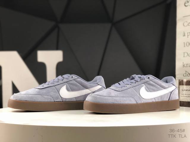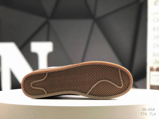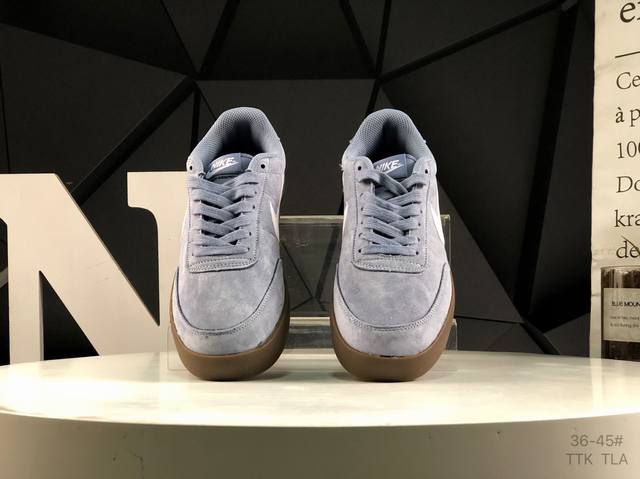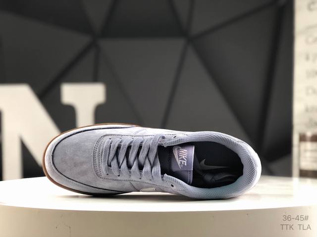 此次品牌选用Nike旗下经典带款Nikekillshot 鞋款为蓝本,采用帆白色、藏蓝色和生胶色的配色设计。帆布与魔皮材质打造的鞋身,质感十足。
