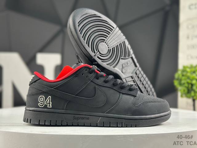 耐克 Supreme X Nike Dunk Sb Low 此款鞋跟上绣有“94”字样,纪念品牌的创立年份,该品牌的标志性徽标还被蚀刻在了中底的侧壁上。鞋垫沿用了标准的红色表面,每只鞋垫上都有Nike Sb标识,并且Supreme的标识横跨左右两只鞋垫。 货号: Hq8487-001 Size: 如图所示 Atc Tca
