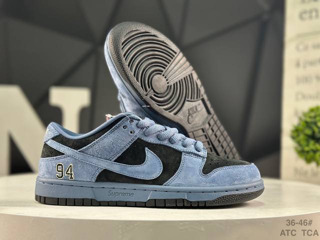 耐克 Supreme X Nike Dunk Sb Low 此款鞋跟上绣有“94”字样,纪念品牌的创立年份,该品牌的标志性徽标还被蚀刻在了中底的侧壁上。鞋垫沿用