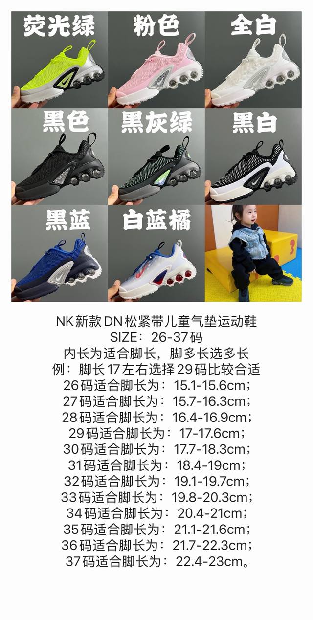 / Nk新款Dn松紧带儿童气垫运动鞋 Size:26-37码 经典Dn气垫系列 优质鞋面拼接,质感超赞 真实后跟气垫填充,脚感超舒服 松紧带一脚蹬设计,穿脱超方便