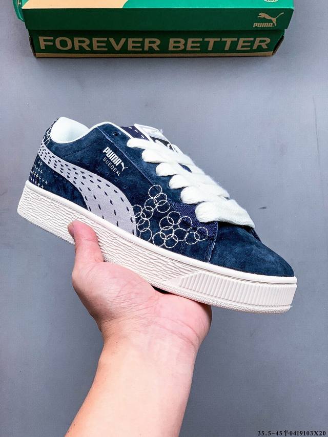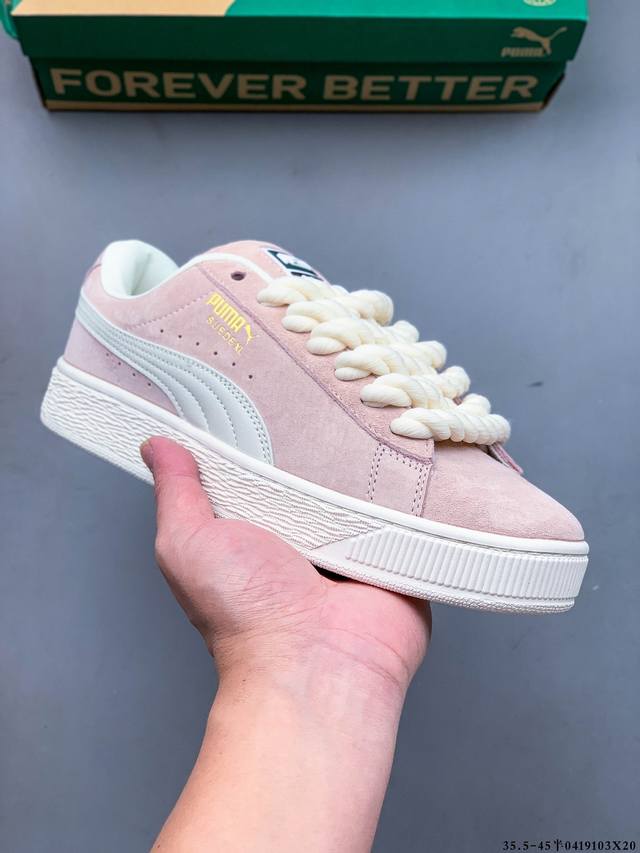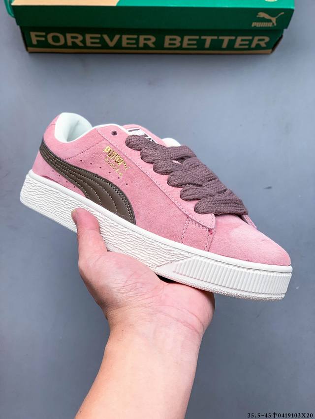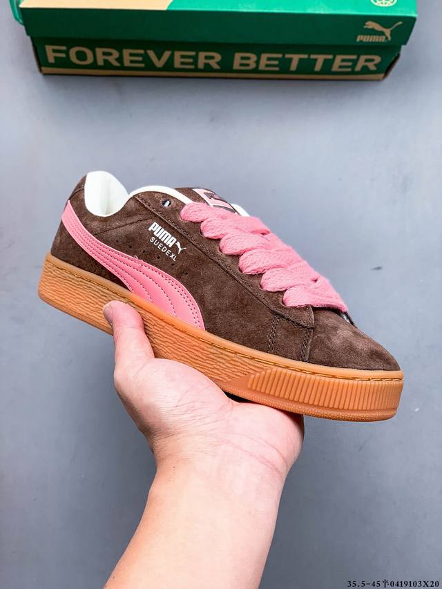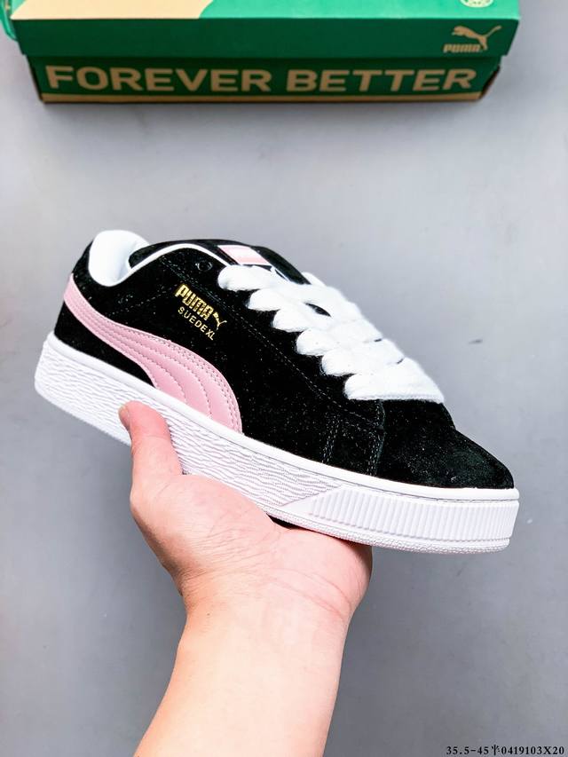 公司级!彪马puma Suede Xl 全新休闲板鞋!鞋身通体采用细腻的麂皮材质,厚实柔软,质感出众;鞋侧保留puma标志性跑道图案,侧面与后跟点缀金属色puma Logo,兼具辨识度与细节感;加厚鞋垫、饱满鞋舌,搭配加宽扁形鞋带,使得穿着感更加贴合与舒适。